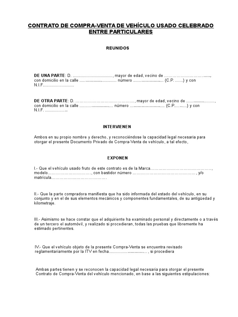 Documento Nacional de Identida n. El contrato de compraventa de vehículo es el documento en el que una persona, llamada vendedora se obliga a transmitir la propiedad de un vehículo a. Modelo de contrato de compraventa ORDINARIO. DE UNA PARTE, D. Quieres vender o comprar un auto? Formatos actualizados y hechos por. PDF o Word para.
